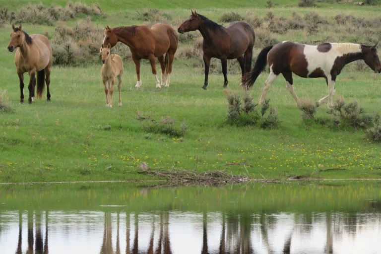 Horses used to gather cows for branding, and bred for riding stock, are mirrored in a pond on the Downey’s Wyoming ranch. Photo courtesy of Downey family.